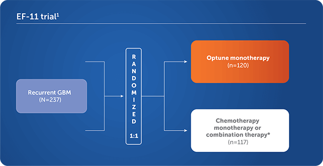 References: 1.Stupp R, Wong ET, Kanner AA, et al. NovoTTF-100A versus physician's choice chemotherapy in recurrent glioblastoma: a randomised phase III trial of a novel treatment modality. Eur J Cancer. 2012;48(14):2192-2202.