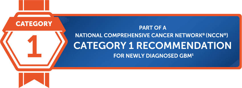 NCCN Clinical Practice Guidelines in Oncology (NCCN Guidelines®)において初発テント上膠芽腫でパフォーマンスステータスが良好*な患者の治療にオプチューン+テモゾロミド併用治療がカテゴリー1で推奨されました。1