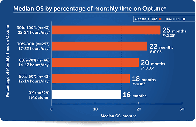 References: 1. Optune Instructions for Use. Novocure 2018. 2. Stupp R, Idbaih A, Steinberg DM, et al. Prospective, multi-center phase III trial of tumor treating fields together with temozolomide compared to temozolomide alone in newly diagnosed glioblastoma. Presented at: 2017 Annual Meeting of the American Association for Cancer Research; April 1-5, 2017; Washington, DC. Oral presentation LBA AACR CT007. 3. Toms SA, Kim CY, Nicholas G, Ram Z. Increased compliance with tumor treating fields therapy is prognostic for improved survival in the treatment of glioblastoma: a subgroup analysis of the EF-14 phase III trial [published online ahead of print December 1, 2018]. J Neurooncol. https://doi.org/10.1007/s11060-018-03057-z. 4. Novocure Data on File OPT-135. 5. Referenced with permission from the NCCN Clinical Practice Guidelines in Oncology (NCCN Guidelines®) for Central Nervous System Cancers. V.1.2018. © 2018 National Comprehensive Cancer Network, Inc. All rights reserved. Accessed March 20, 2018. To view the most recent and complete version of the NCCN Guidelines, go online to NCCN.org.