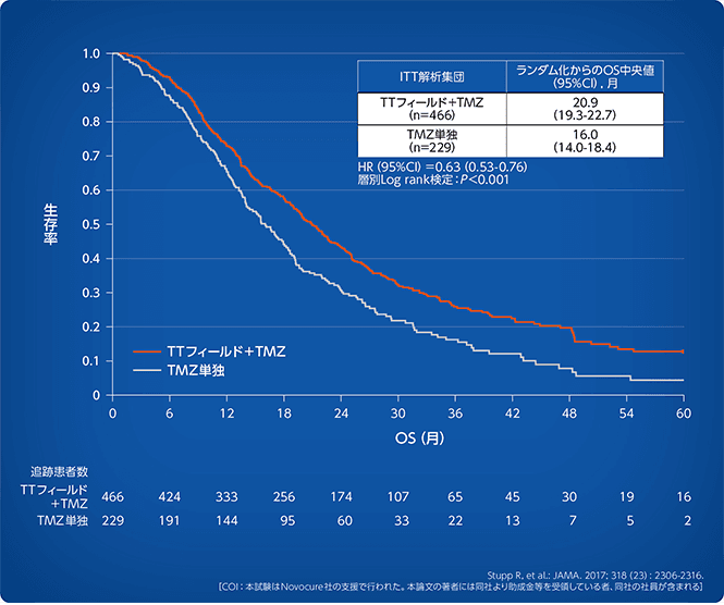 オプチューン+テモゾロミド併用治療群の方がテモゾロミド単独治療群よりも有意に高い2年生存率を示し、5年生存率もその有意差を維持したとの報告があります。1